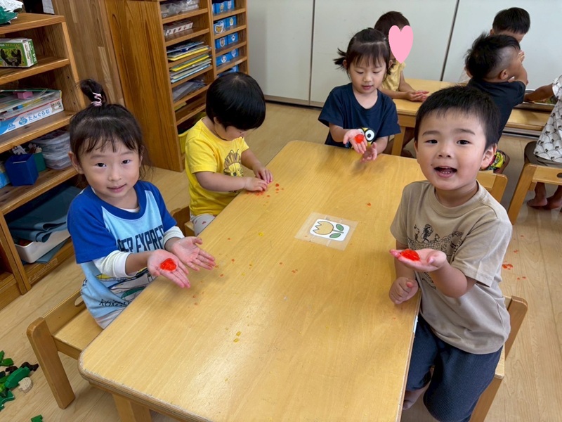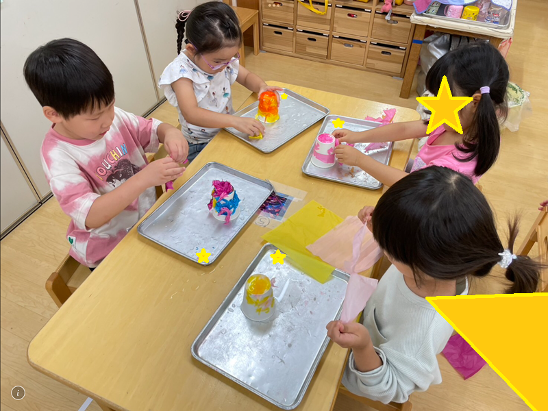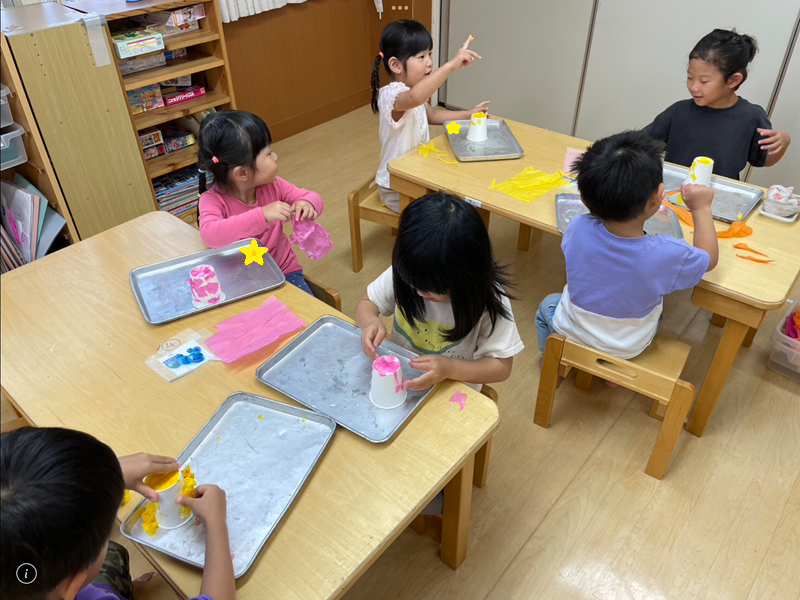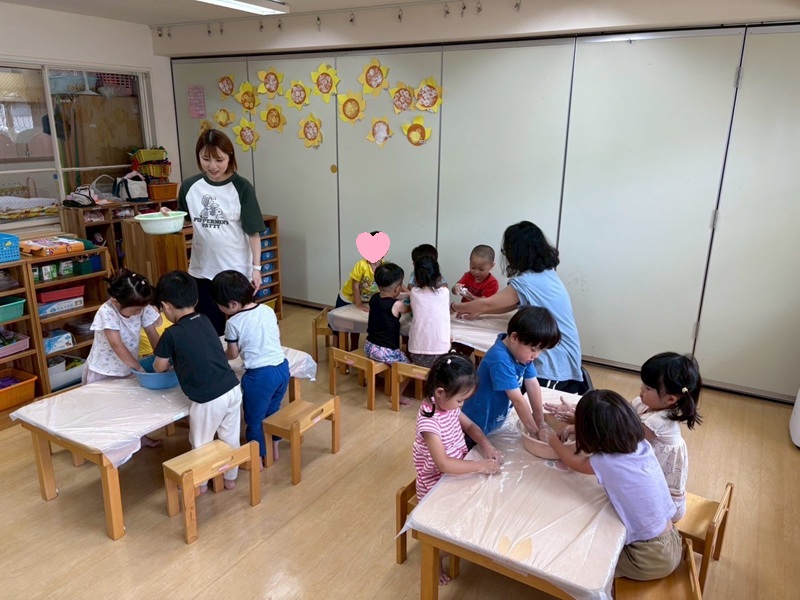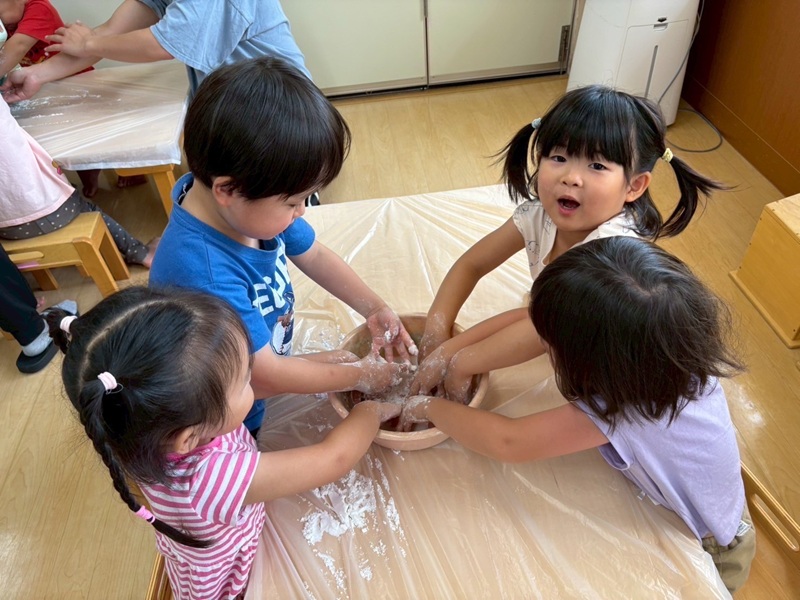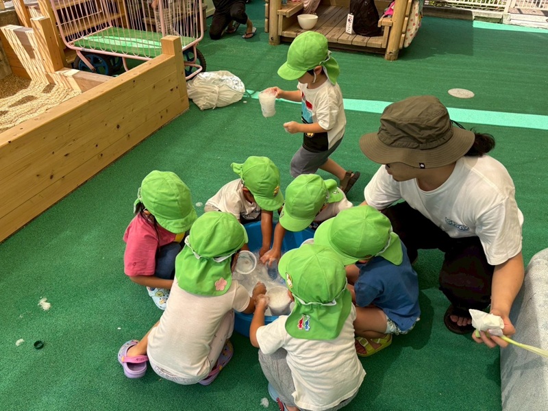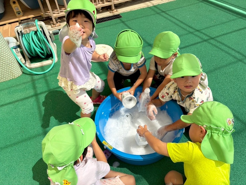 暑さもあり、外での活動はあまりできませんでしたが、 お部屋での寒天や片栗粉粘土で感触遊びを楽しんだり、 園庭の水遊びで石鹸を使って、泡あそびを楽しみました。 |