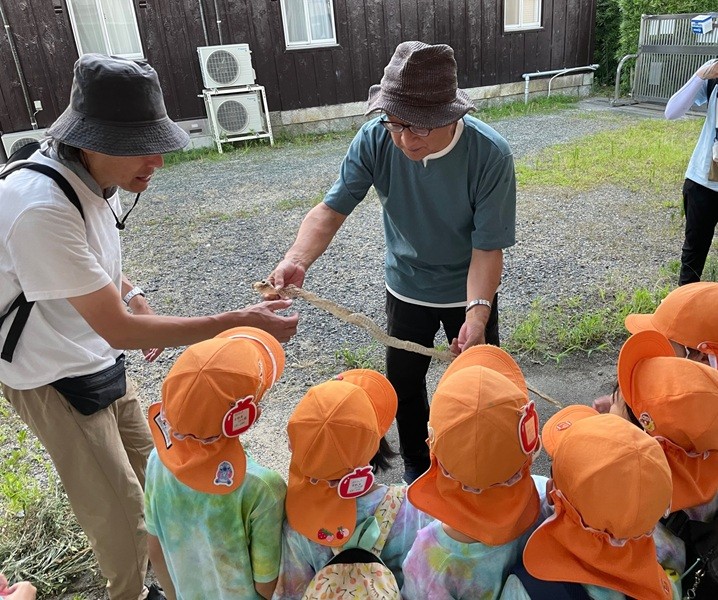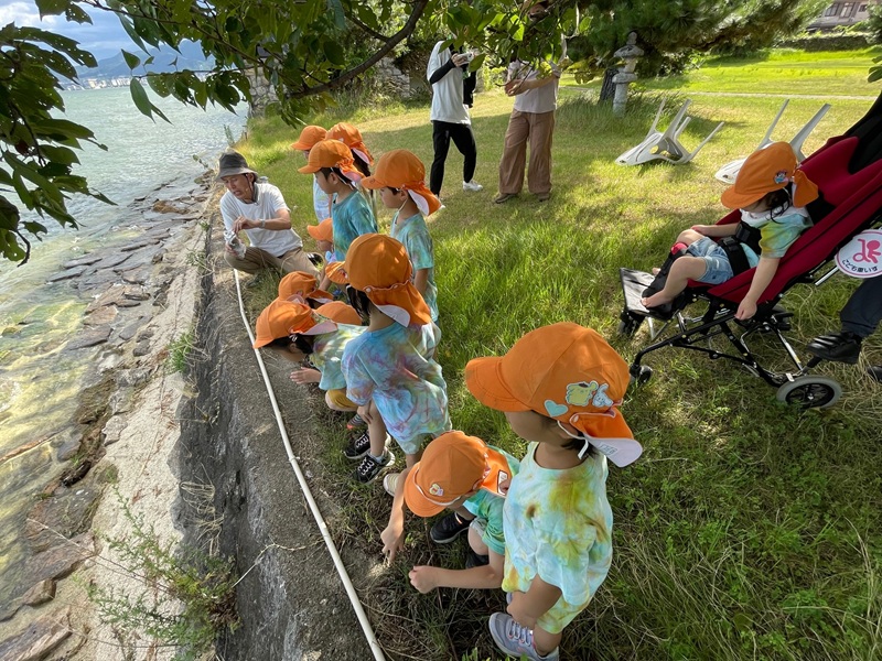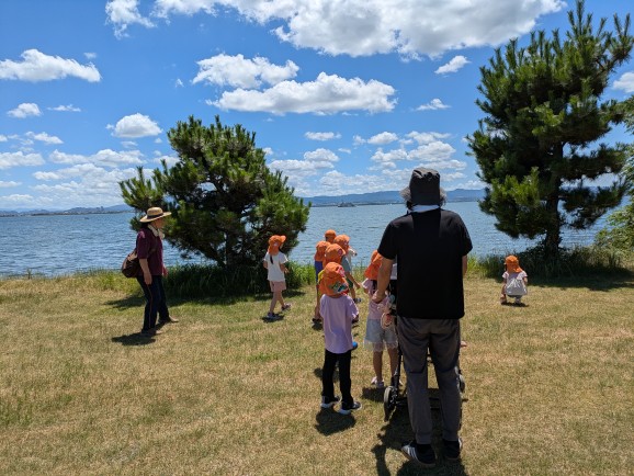 年長、すずらんさんがお楽しみ保育に行きました。 滋賀県にある、メリノールハウスをお借りして楽しみましたよ。 琵琶湖の湖畔にあり、とても天気の良い一日でした。 管理されている方の「お約束」のお話を聞き、 その後、なななんと!!蛇の抜け殻を見せてもらいましたよ。 クッキングをしたり水遊びを楽しんだり、野原でおもいきりあそびました。 水遊びの後は、おたのしみ保育の向けて一人ひとり、作った絞り染めTシャツが登場!! おそろいのTシャツに着替え、湖畔から琵琶湖の海原をみんなで 心豊かにゆったりと眺めました。 クッキングで作ったサラダとBBQみんなで作って食べるって、本当においしいね。 あっという間の半日に及んだ「お楽しみ保育」。 楽しい仲間との思い出や繋がりが、より一層深まった日でした。 |