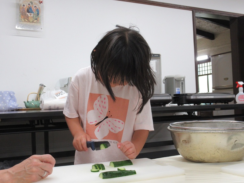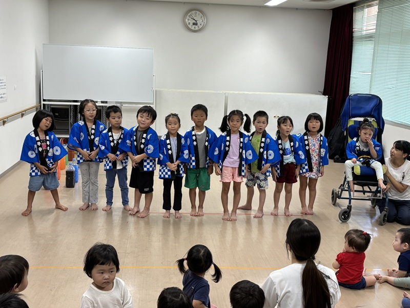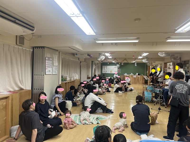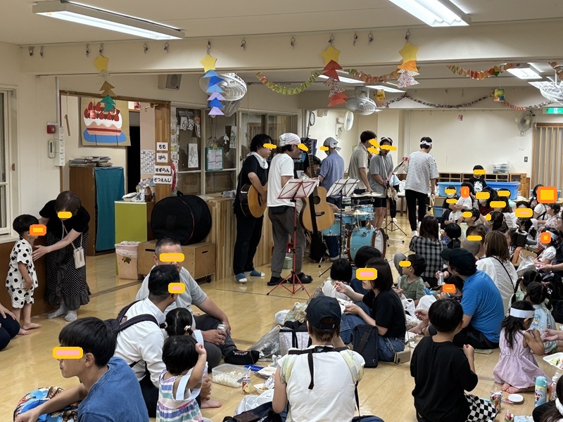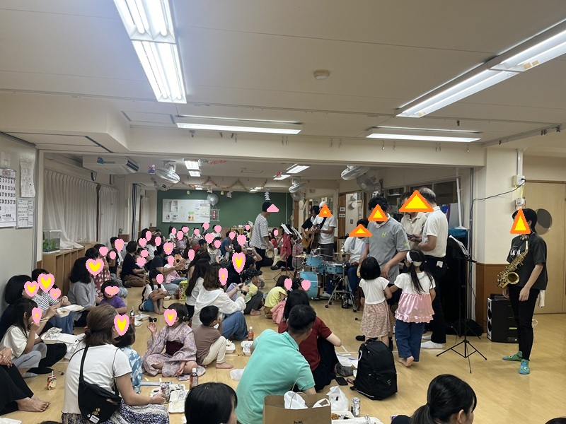 今年もやってきました!『交流夏祭り』 乳児部門、幼児部門に分かれて2階でお食事と お父さん、職員でつくる「おやじバンド」による音楽会もありましたよ。 はい!もちろん大盛況でした!! 年々、腕に磨きがかかってきています。(*´艸`*) 楽器はギター、ピアノ、ドラム、サックス、タンバリン。そしてボーカル。 サックスは特別参加の女性です。 曲に合わせ会場のみんなも一緒に歌ったり、踊ったりしていましたよ。 1階では子ども達に向けて、お話コーナーやゲームコーナー、多文化シアターもあり 子ども達、保護者の方々、先生もみんな集まって楽しいひとときを過ごしました。 |