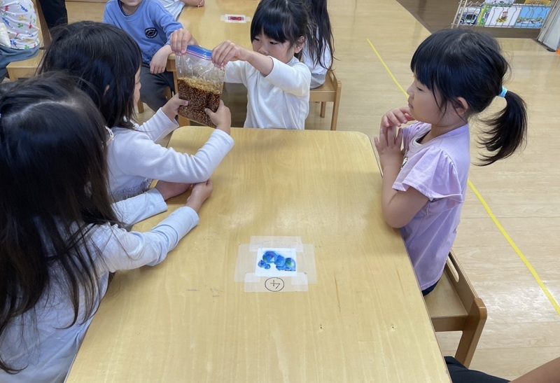 すずらんさんが、5月の装飾をのぞみの園(特別養護老人ホーム)にすずらんさんが 持って行きました。玄関口に出てきて待って下さっていました。 (ありがとうございます(#^.^#)) 子ども達の作品、姿に目を細めて喜んで下さっていました。 幼児さん、みんなで「塩こうじ」「醤油こうじ」作りをしました。 毎年恒例になっています。ちゅうりっぷさんは今回が初参加。 調理の先生に教えてもらいながら 「こうじと醤油」「こうじと塩」それぞれ計量してある物を 袋に入れて、みんなで揉み揉み。 出来上がったら、調理で使い食事に出されます。 今年度もみんなが作った塩こうじ、醤油こうじを使っての 美味しい給食がいっぱい出来そうです。 |