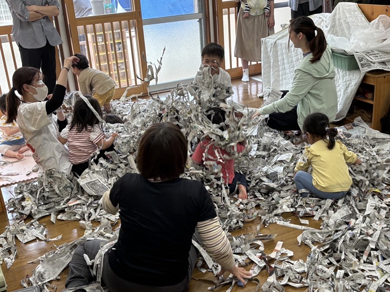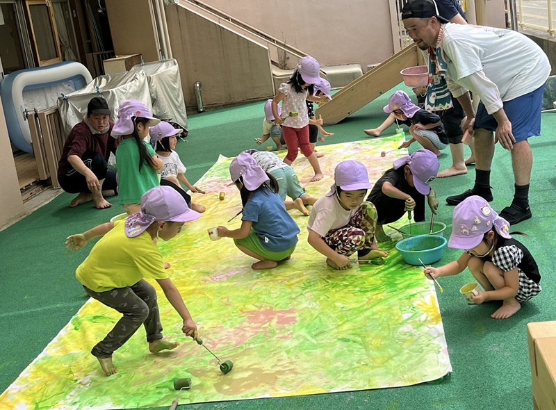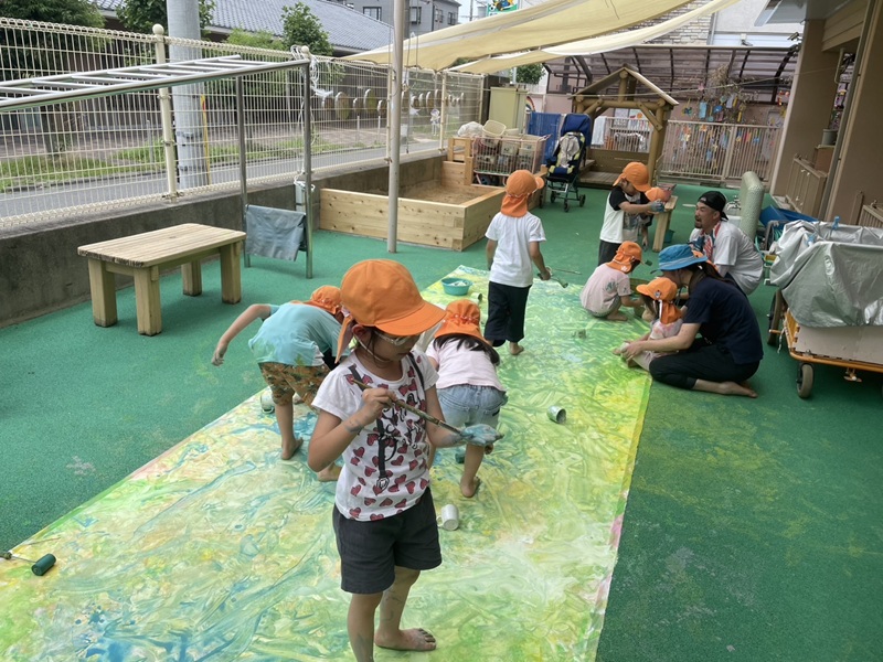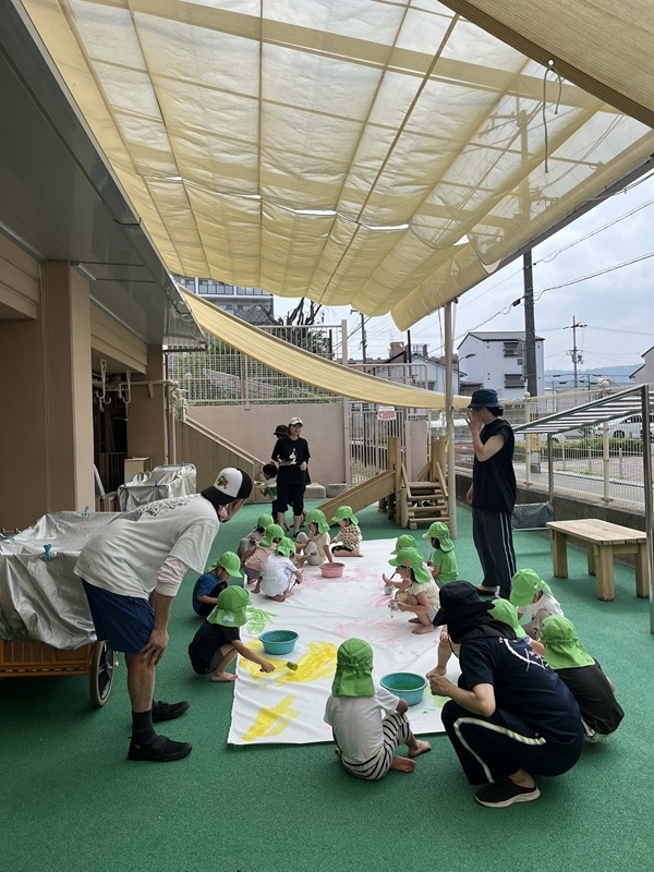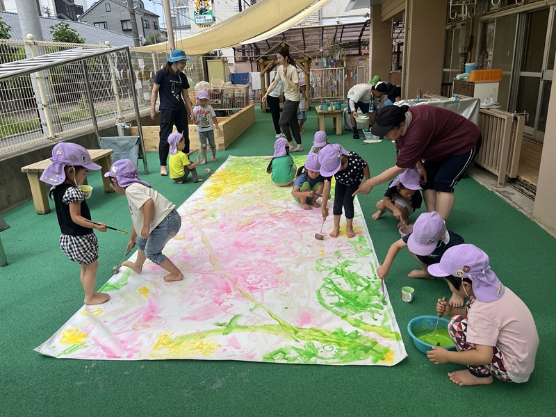 幼児クラスのみんなで、中LAさんと造形遊びをしました。 大きなキャンバスいっぱいに絵の具でダイナミックに描きました。 ちゅうりっぷさんが1番はじめに描き出しました。 そして、次はかんなさん、最後はすずらんと。 新しくなった園庭いっぱいに広げ、裸足で気持ちよく遊んでいました。 腕を大きく動かし描く姿や、小さく何かを描く子もいます。 終わる頃には身体に絵の具がいっぱいで、みんな楽しそうでした。 「ほら~こんなになってん」とニコニコで造形遊びを やりきった、誇らしい表情を見せてくれました。 |