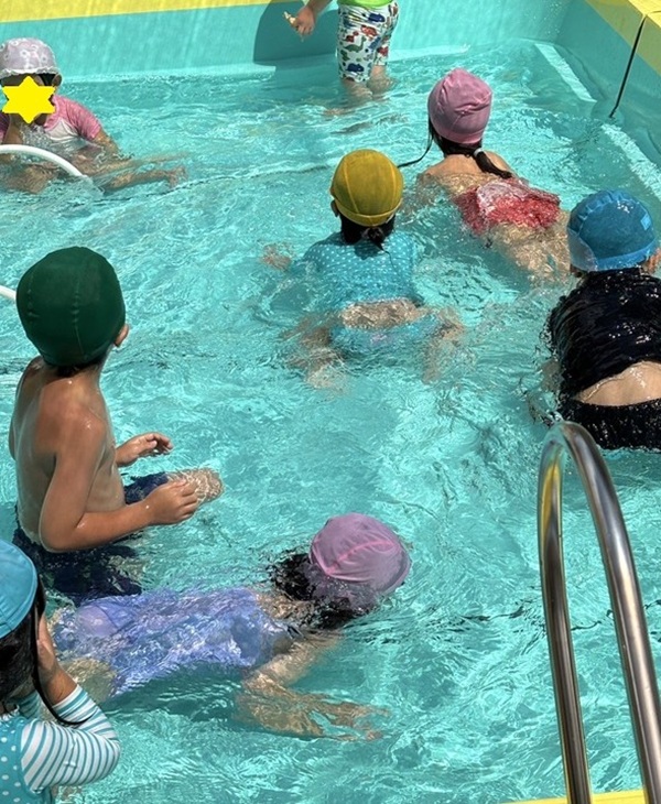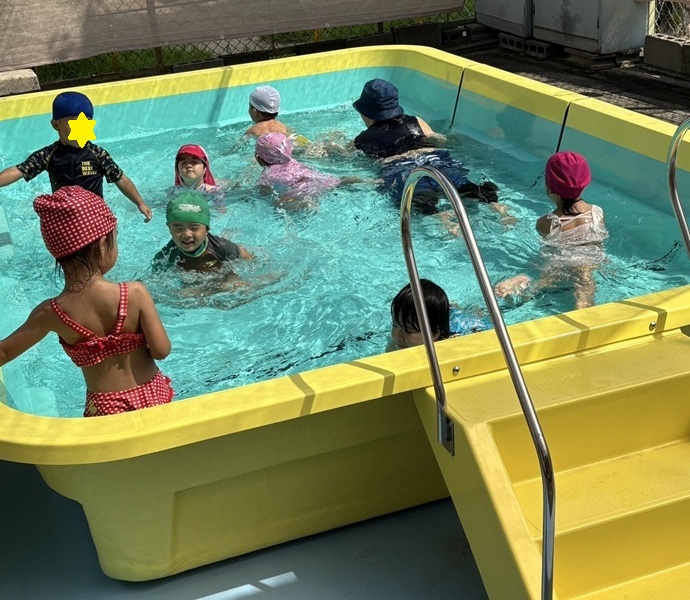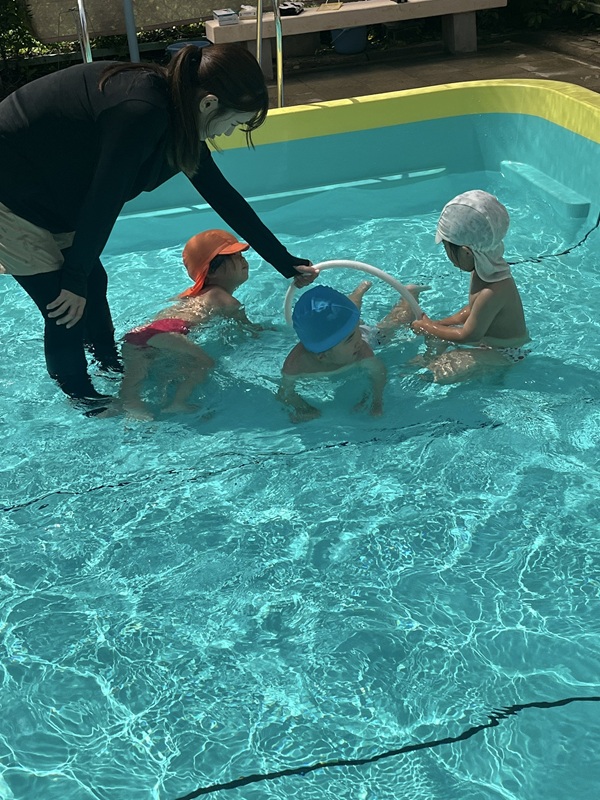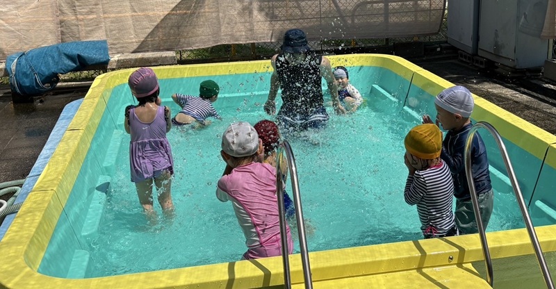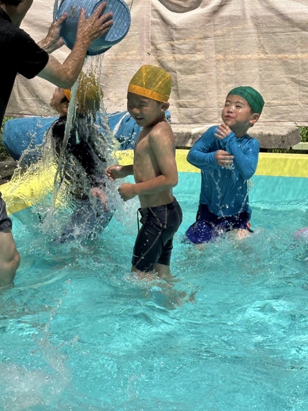 今年の夏も、水遊びや、プール遊びをたくさん楽しみましたよ。 顔に水がかかるのが、苦手なお友達も少しずつ慣れていきました。 乳児さんは、新しくなった園庭で大きなビニールプールを膨らませやりました。 幼児さんは隣りの公園で、深めのプールで遊びましたよ。 子ども達は、水が大好きですね。 友だちと水に一緒に、水に慣れ親しんだ7.8月でした。 |