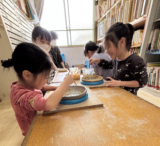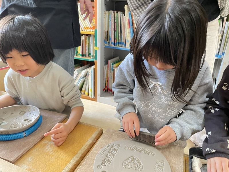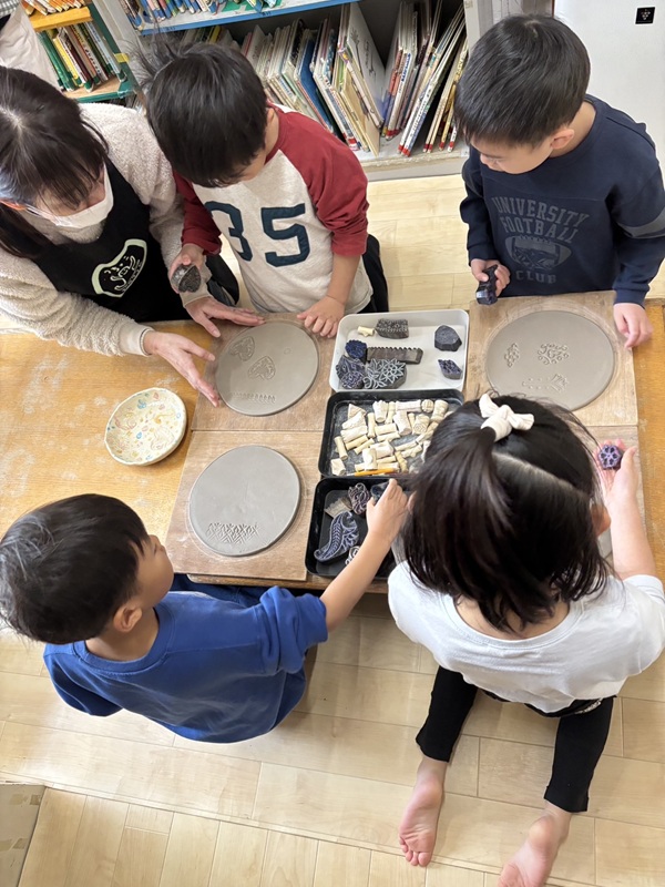 毎年、年度末が近づく頃にすずらん組は、マイお皿作り「陶芸」を経験します。 陶芸の先生「橘さん」に来ていただき、丸い円盤形になった土に 型押しをして、色付けをしていきます。 出来た作品は、橘さんが持ち帰って下さり。窯で焼いて下さいます。 そして、3月には一人ひとりの出来上がった作品で食事をします。 みんな、嬉しそうに作品作りを楽しんでいました。 出来上がりが楽しみだね。 |