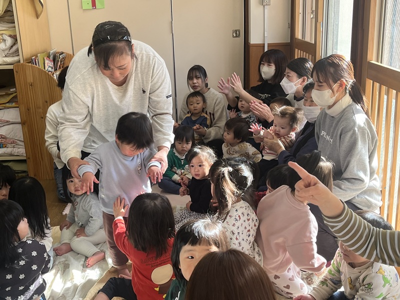 1月30日に誕生日会がありました。毎月、乳幼児分かれて行っています。 乳児さんは、ゆり組に集合して始まります。 園長先生がお話もしてくれますよ。 誕生日の子ども達は、♬「ハッピーバースデイ」の歌に合わせ みんなに「タッチ」をしに行きます。 みんな、手を広げてタッチを待っていますね。 タッチする子もされる子も、嬉しい誕生日会です。 乳児は、最後に担任の先生が「高い高い」をしてくれますよ。 見つめ合う表情は、幸せがいっぱい詰まってますね。(*´艸`*) |